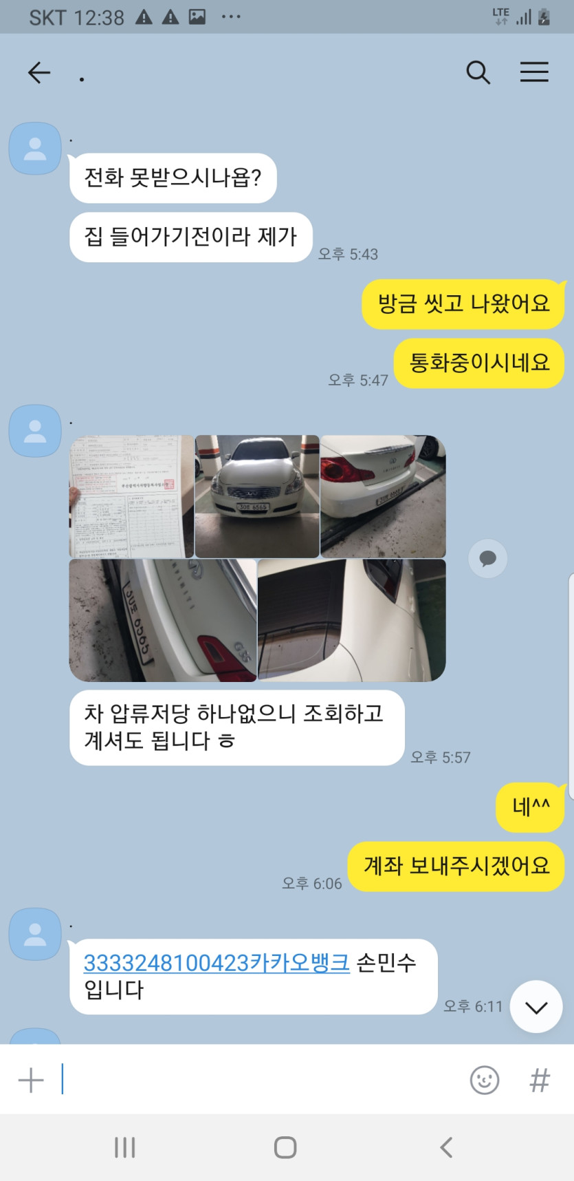 전 무보증,달차를 구한다고 글을 올렸는데요 어제 카톡으로 연락이 왔습니다 자신은 부산에 있고 세컨카 있으니 임대 하겠다며 연락이 온겁니다 그래서 제가 신원이 확실한 재직증명서와 면허증을 오늘 보내니 마침 오늘 보내려고 했다면서 서로 통화로 보험과 월차임대로 부분을 상의하고 탁송으로 보내준다고 해서 총 21만원을 입금했습니다 ㅜ 근데 그때가 벌써 저녁 6시30분쯤이고 갑자기 만원을 더 붙이라고 해서 더 보냈구요 근데 부산에서 여기까지 올시간이 훨씬 지난는데 차주는 전화도 안받고 카톡 차단했더라구요 근데 입금명 그리고 차 ㄷㄹㅈ모두 동일인데 ㅜ 하....제보 부탁드립니다